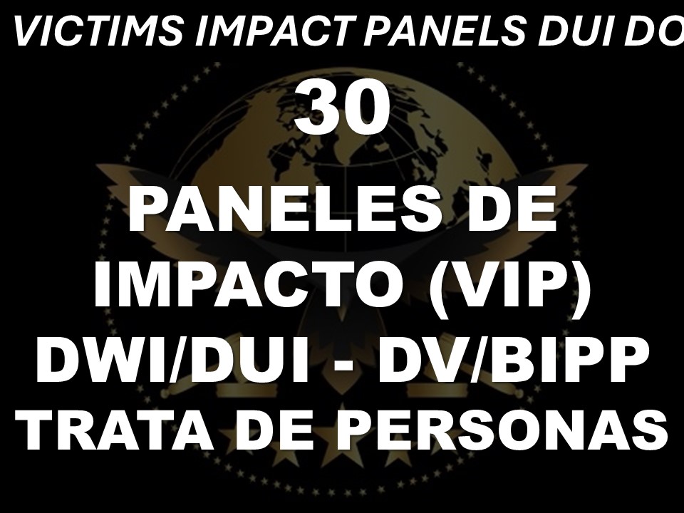 Panel de Impacto de Víctimas: Clases de 2, 4, 6 y 8 horas diseñadas para compartir testimonios de sobrevivientes de DUI, violencia doméstica, trata de personas y explotación sexual, y fomentar una perspectiva compasiva sobre la importancia de ser humano. Incluye comprobante de inscripción y certificado instantáneo.