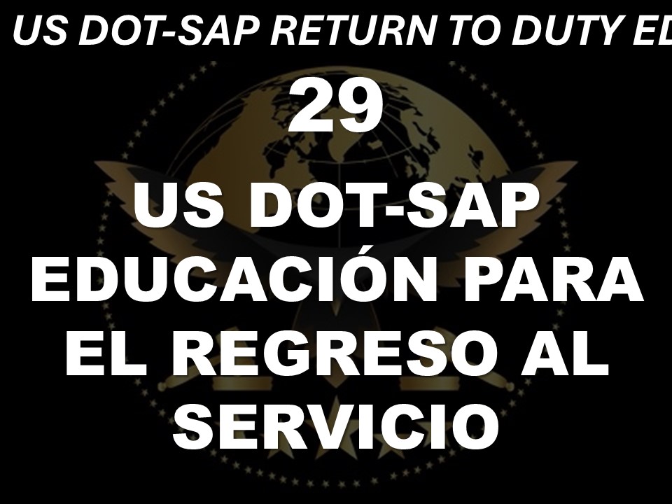 Cumple con todos los requisitos de capacitación Del Departamento De Transporte De EE.UU. (US DOT-SAP)(DOT 49 CFR. La norma del Departamento de Transporte (DOT)), 49 CFR Parte 40, describe los procedimientos requeridos para realizar pruebas de detección de drogas y alcohol en el lugar de trabajo para la industria del transporte regulada por el gobierno federal. Incluye comprobante de inscripción y certificado.